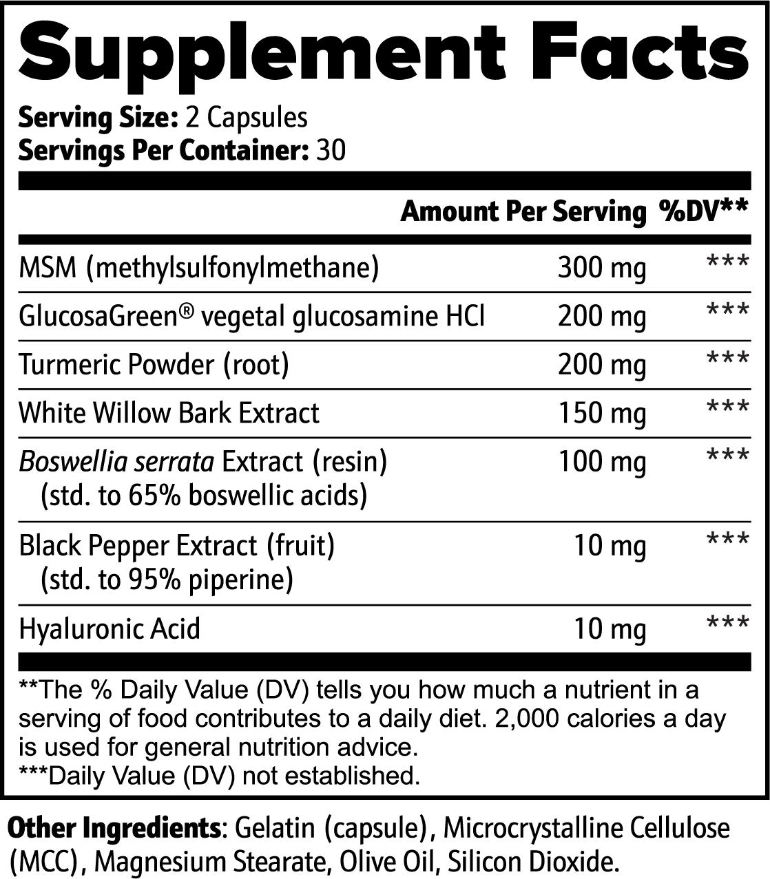 MSM and GlucosaGreen® vegetal glucosamine HCl are vital for maintaining healthy joint function and flexibility, helping to rebuild cartilage and lubricate joints.